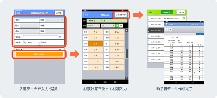 納品書作成画面では項目を選ぶだけで納品書が作成できます。納品書データはHTMLやエクセル、CSV形式で保存されます。 その場で印刷、メールデータを送ることもできます。