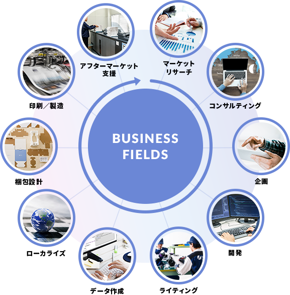 テクニカルドキュメンテーションのビジネスをベースに、顧客の新製品開発に際しての市場動向調査や各国の法令確認、さらには、印刷の後作業である製品の梱包設計や印刷物輸送などドキュメント制作以外の周辺業務にまで業務の幅を拡大、お客様である企業へのサービスを川上から川下まで一貫してサポートしています。また、ドキュメント制作の効率化に合わせ、原稿作成支援ソフト、翻訳支援ソフト、加えてデータ管理システムなど、お客様が自身でドキュメントの開発を行えるよう、ドキュメント作成ソフトの開発・販売にもビジネス展開を行っております。