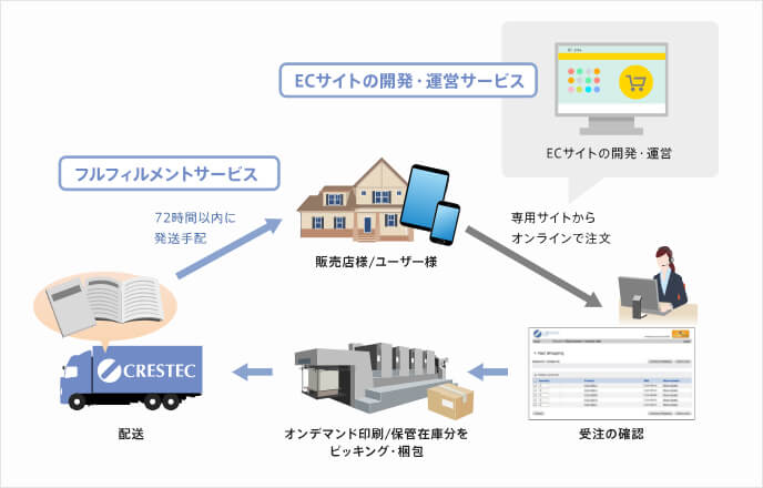 クレステックがご提供するECサイト(マニュアルオーダーシステム)は、年中無休でお客様のご注文を承ります。繁忙期や休日祝日などで急激に需要が変動した場合でも、柔軟に対応し商品のお届けが可能です。また、マニュアルの再販に関するお問い合わせにお答えするコールセンターの運営も承っています。