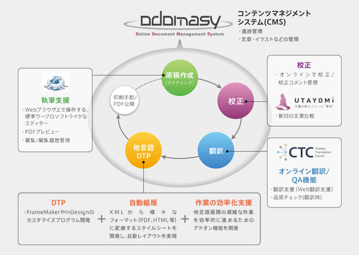 一連の制作プロセスをシームレスに支援するクラウドサービス「odomasy」は、執筆、翻訳、DTPといった多岐にわたる業務を一元管理できます。手間や時間の削減、ミスの防止、制作効率の向上に威力を発揮します。