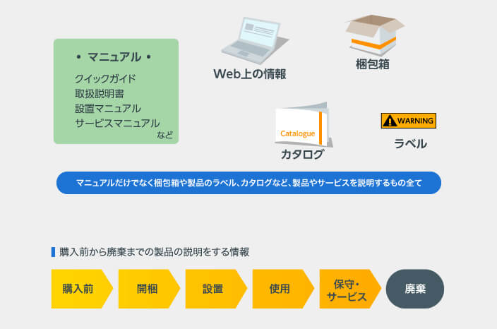 使用説明とは、取扱説明書やサービスマニュアルだけでなくカタログや梱包箱、製品のラベル、など、購入前から廃棄までの全ての時期を対象として、製品やサービスを説明するもの全ての情報です。