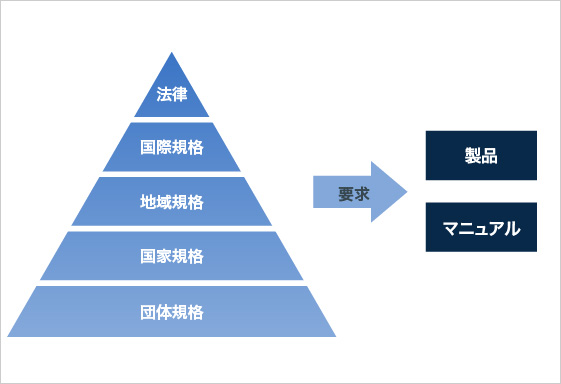 製品に適用される法律や規則や規格の要求を確認し、マニュアルへ記載する関連事項の洗い出しをします。