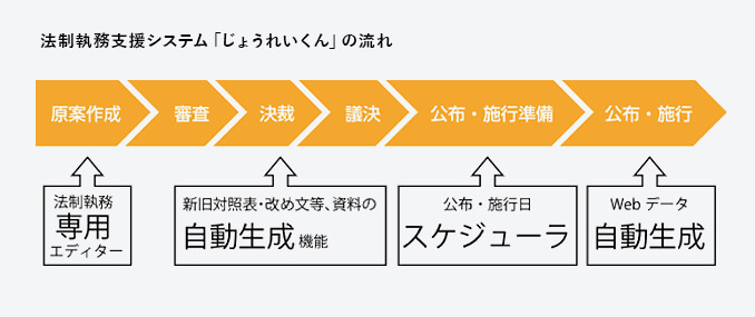 法制執務で一番大変なのは、原案作成です。『じょうれいくん』は専用のエディターを使い、文書構造の標準化や用語統一、正確性を向上させます。また、決裁や議決の工程では、自動で新旧対照表・改め文などの資料を生成するので、統一性のある資料が作成できチェックの工数も削減できます。自庁内での例規集の更新。 『じょうれいくん』は例規集・規則集のデータをXML形式でデータベース化し、ウェブブラウザから改正作業や公開がかんたんにできます。