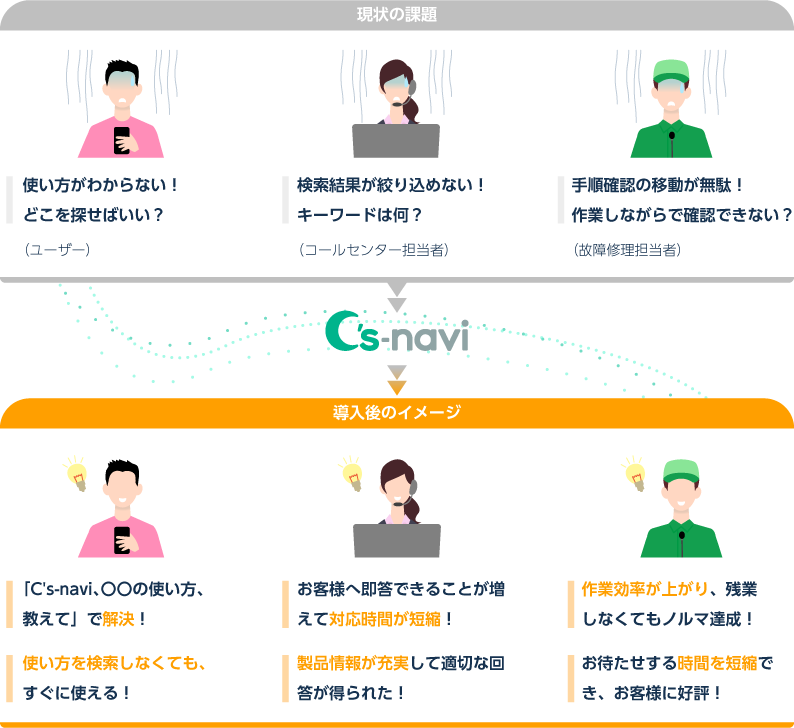 C’s-naviの特長は、情報を「探す」のではなく「教えてくれる」ということ。製品の使用や業務上の様々な課題を解決し、CS(顧客満足度)の向上に貢献します。