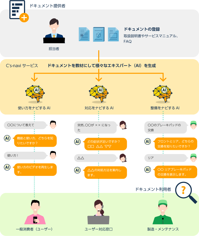 Cʼs-naviの特長である対話型AI。既存のドキュメント資産(取扱説明書、動画マニュアル、FAQ等)から、御社の製品に精通したエキスパート(AI)を生み出します。