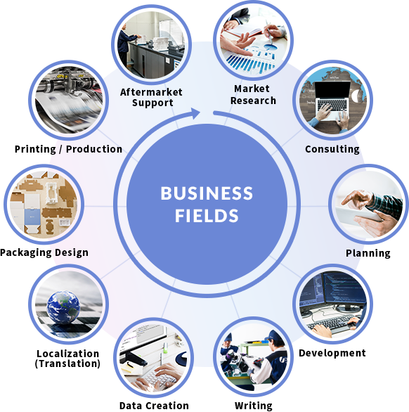 Technical documentation business is our foundation, so we provide integrated upstream and downstream support for our client companies. In addition to performing market trend surveys and confirming the laws and ordinances in other countries regarding new products being developed by our clients, our support also expands beyond document creation and printing to related business such as packaging design and transport of printed materials. Additionally, in the interest of improving the efficiency of document creation, we are engaged in expanding our business to the development and sales of document creation software such as manuscript creation support software, translation support software and data management systems in order to put the power to develop documents into the hands of our clients.