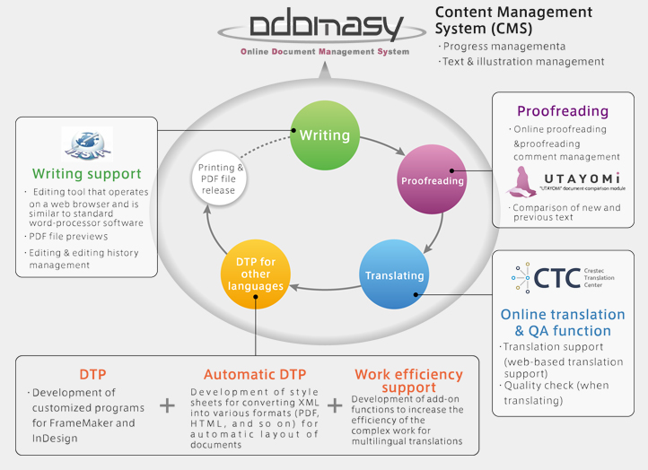 odomasy is a cloud service that supports a seamless production process flow, allowing you to centralize various types of work, such as writing, translating, and DTP (desktop publishing). This system is very effective at reducing labor and time, preventing errors, and improving production efficiency.