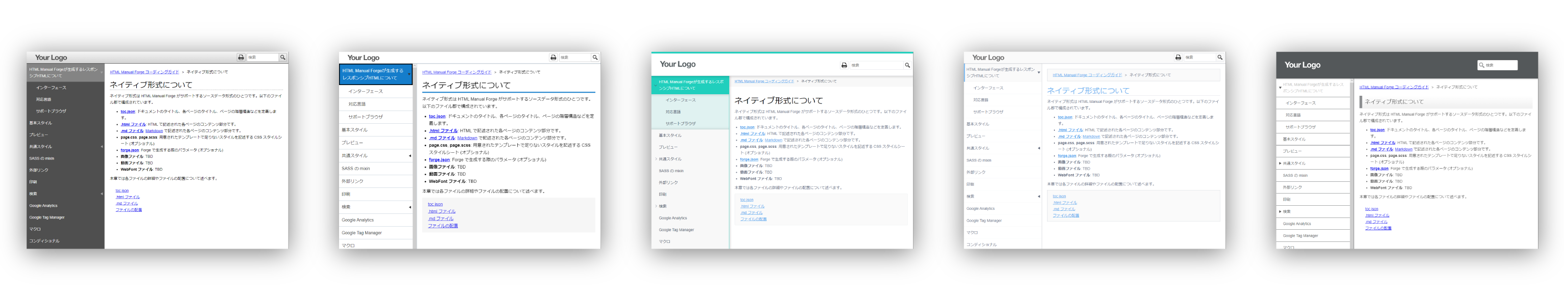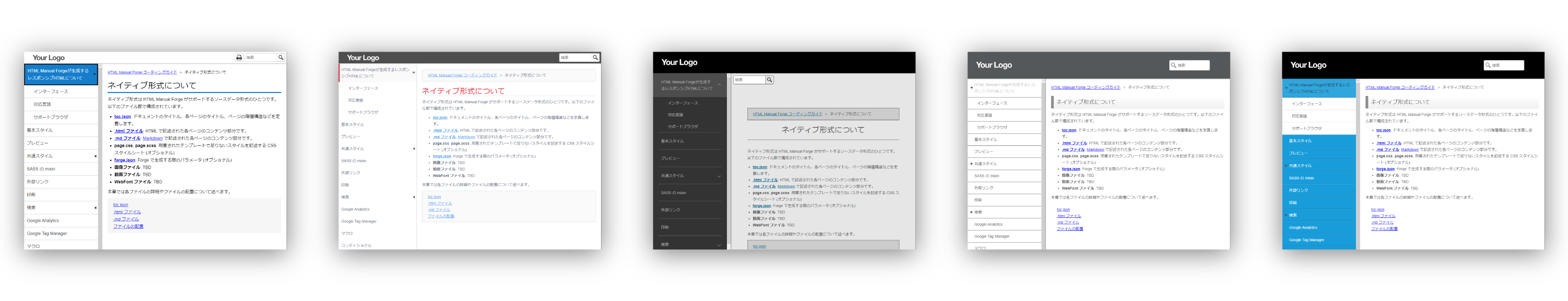 ハンバーガーボタンによるスライドメニューやキーワード検索など、必要なインターフェースはすべて実装済み。 現在お使いの Office ⽂書や PDF の各ページを HTML に乗せ換えて、後は HTML Forge がレスポンシブHTML として⽣成します。